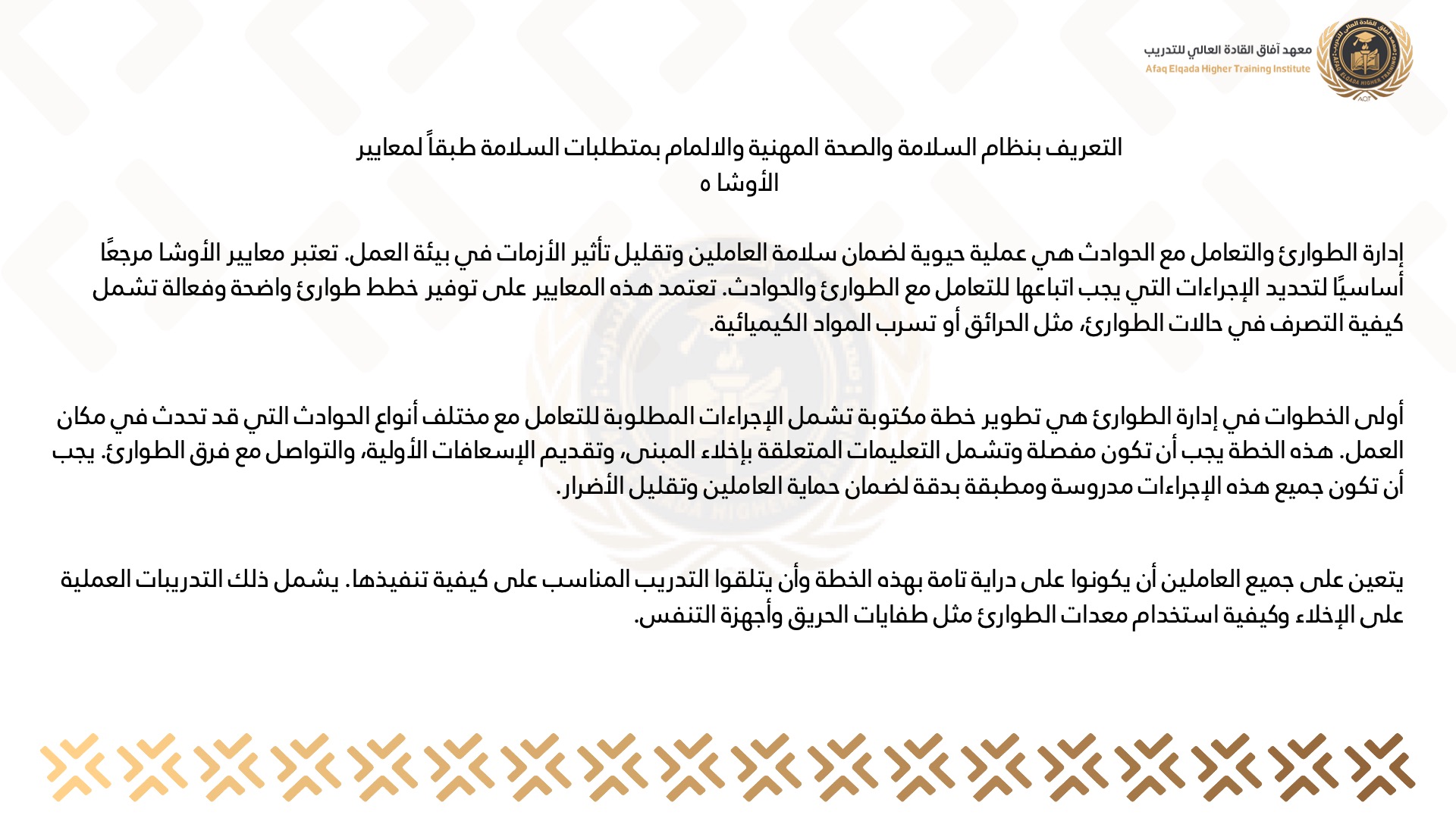 التعريف بنظام السلامة والصحة المهنية والالمام بمتطلبات السلامة طبقاً لمعايير الأوشا 5