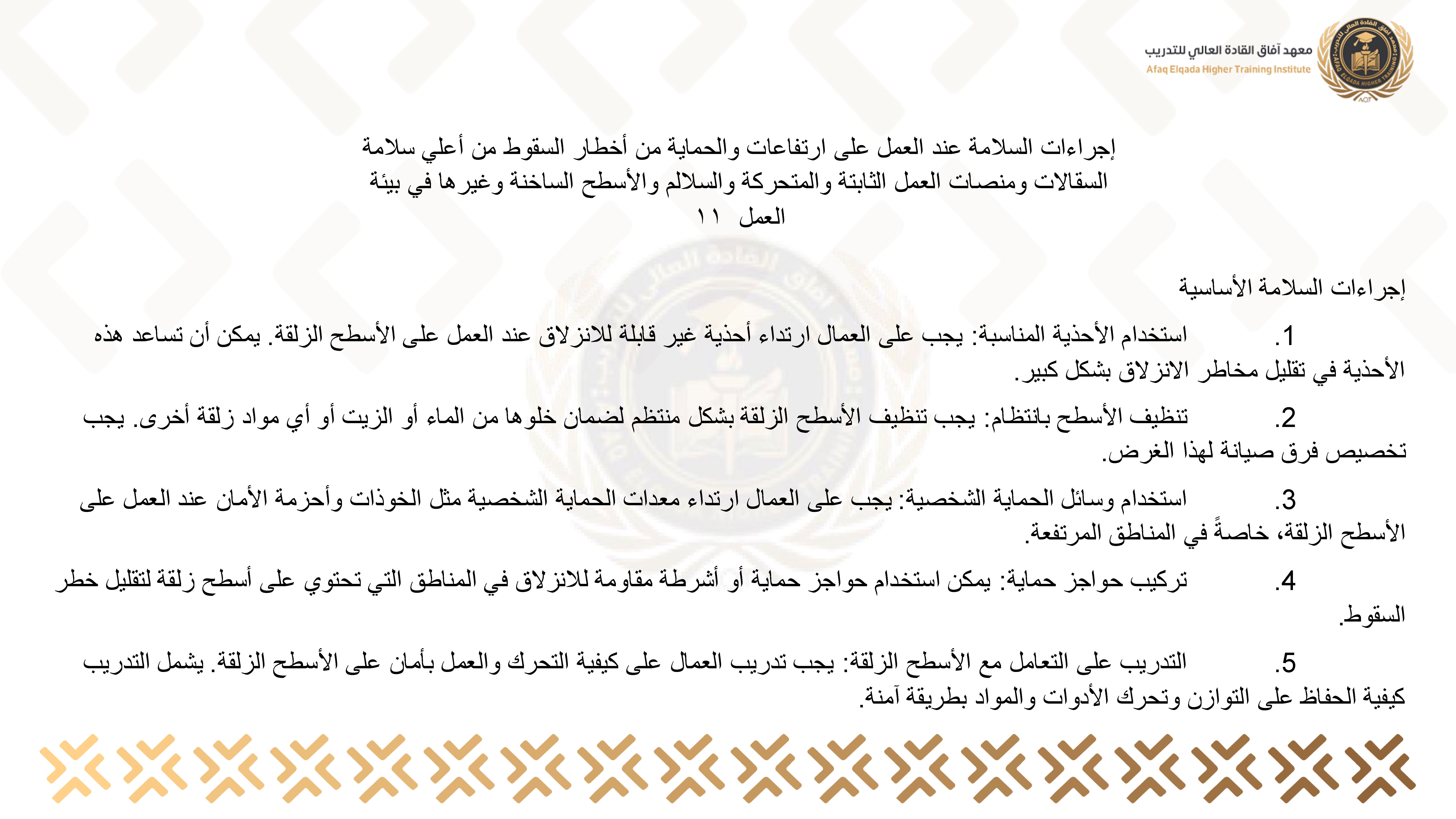إجراءات السلامة عند العمل على ارتفاعات والحماية من أخطار السقوط من أعلي سلامة السقالات ومنصات العمل الثابتة والمتحركة والسلالم والأسطح الساخنة وغيرها في بيئة العمل) 11