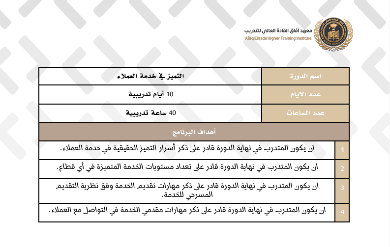 يهدف هذا البرنامج التدريبي إلى تزويد المشاركين بالمهارات والمعارف اللازمة لتقديم خدمة عملاء متميزة وتعزيز تجربة العملاء. يغطي البرنامج أسس التواصل الفعّال، كيفية التعامل مع شكاوى العملاء بفعالية، وبناء علاقات طويلة الأمد مع العملاء. كما يركز على تطوير مهارات الاستماع والتفاعل الإيجابي مع احتياجات العملاء لضمان رضاهم وولائهم. الأهداف: فهم أهمية خدمة العملاء ودورها في نجاح الأعمال. تطوير مهارات التواصل الفعّال والتعامل الاحترافي مع العملاء. تعلم تقنيات التعامل مع الشكاوى وحل المشكلات بفعالية. تحسين تجربة العملاء وبناء علاقات إيجابية طويلة الأمد. المستفيدون: موظفو خدمة العملاء. مدراء فرق خدمة العملاء. العاملون في مجال المبيعات والدعم الفني.